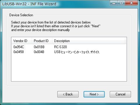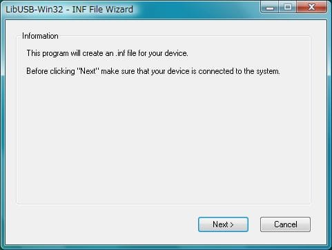 先日購入した PaSoRi の inf ファイルを作ってみることにする。 このサイトから libusb-win32-device-bin-0.x.x.x.tar をダウンロードしてくる。 中にある inf-wizard.exe を実行し、ウィザードに従って進めていくと inf ファイルが出来る。