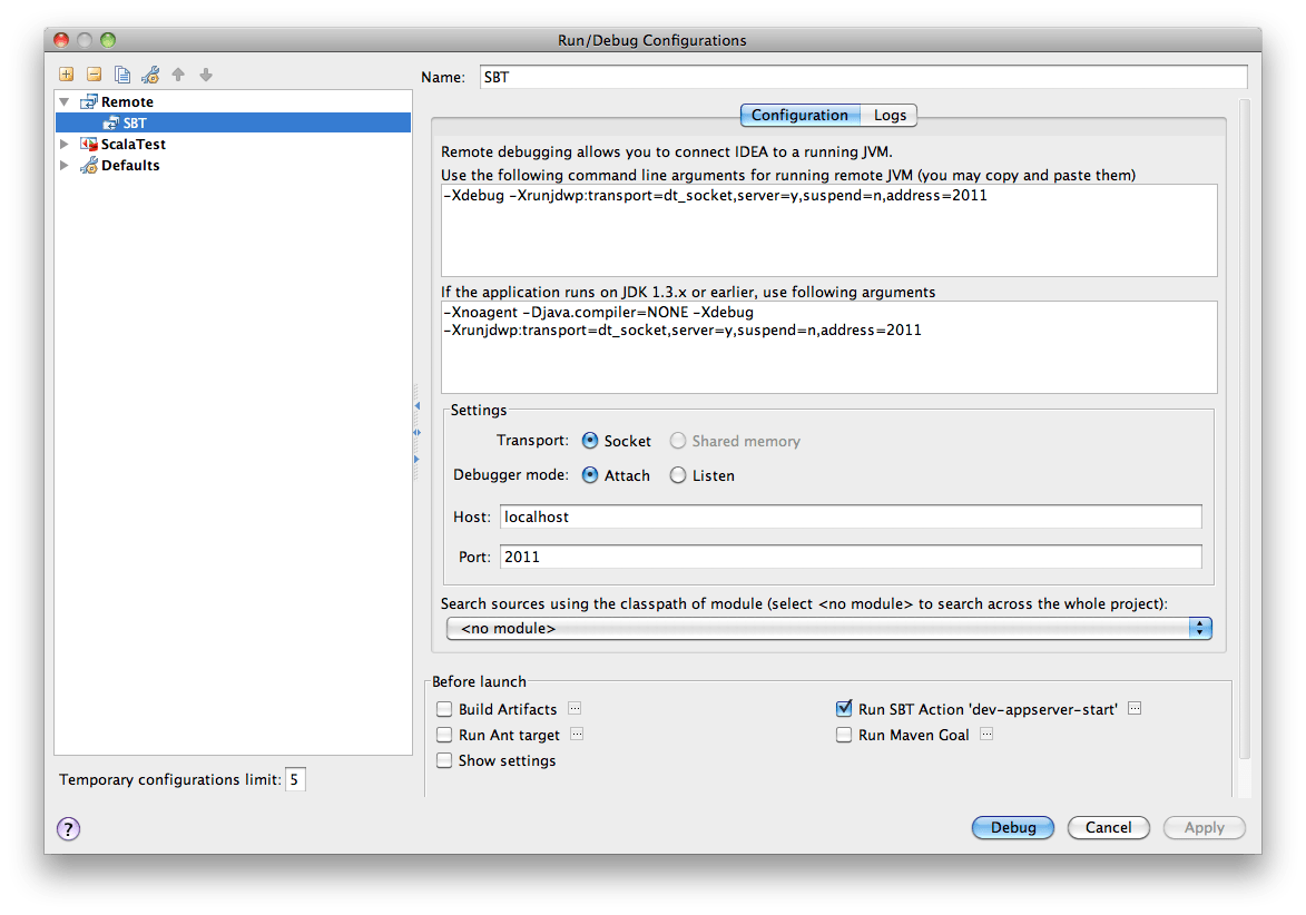あとは sbt で reload 後、IDEA でデバッグするだけ。 appserver 起動後に IDEA がコネクションを張りに行くはずです。