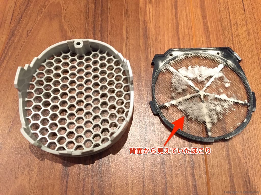 一応、手前にもフィルターがあるんだけど、使い続けているとそのフィルターから内部にほこりが入り、2 つ目のフィルターに溜まる。